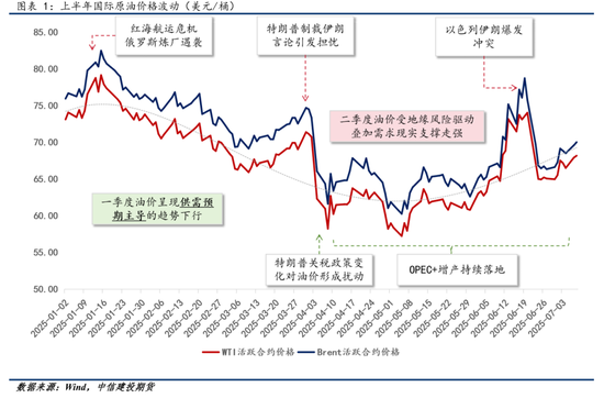 上半年国际油价主要围绕供需预期、关税政策、地缘风险以及现实需求表现等多方面因素逐步展开。其中,供需预期驱动油价进入下行趋势,特朗普的关税政策又导致了进一步的下行冲击;而地缘风险的扰动则将油价从底部快速拉升后又驱动回落,最终年中的现实需求表现对油价形成了一定的支撑。