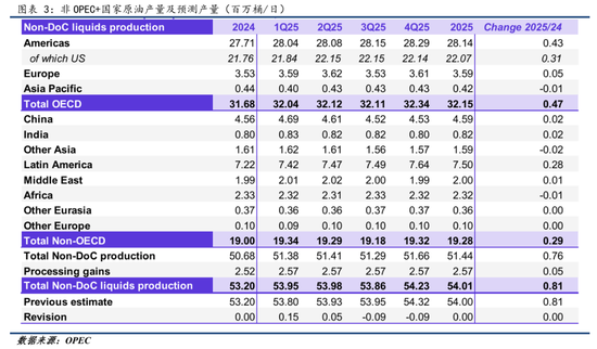 非OPEC+国家产量的增长呈现聚集性特点,欧洲及中国的产量变化空间有限,而南北美洲成为原油供应的核心驱动。