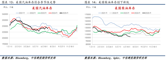 6月开始,全球炼厂开工恢复,裂解价差支撑,美国炼厂开工率持续走高,市场开始调整前期对于需求的偏悲观预期。从美国成品油表观消费来看,目前仍属于季节性的需求驱动,并未实现超越季节性的需求超预期表现。美国旺季需求驱动下,汽柴油库存走低,美原油和库欣库存也保持近年低位,这对油价形成一定的支撑,其中柴油库存创下近年新低。但当前的偏低库存不仅来自于季节性需求的驱动,也来自于弱预期条件下市场累库动能的不足。