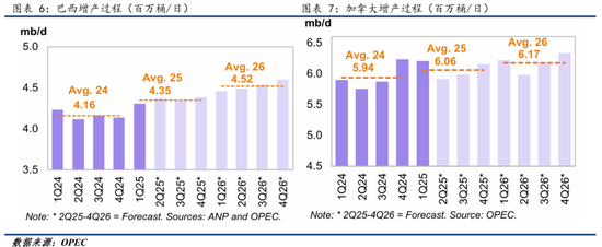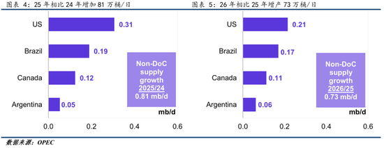 下图显示了OPEC预计的美国、巴西、加拿大和阿根廷四国在2025年和2026年相比前一年的产量增长,其中四国在25年的增产幅度就达到80万桶/日,按照EIA和IEA的测算,这样的增产已经能够满足全球的需求增长。