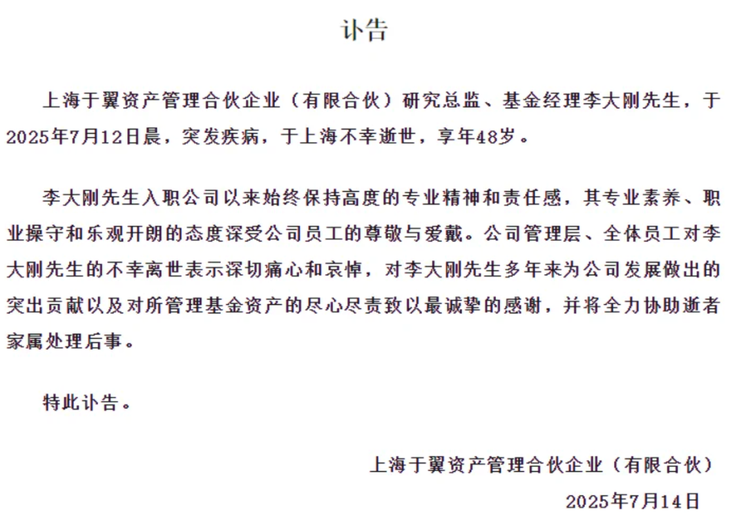上海于翼资产公告:上海于翼资产管理合伙企业(有限合伙)研究总监、基金经理李大刚先生,于2025年7月12日晨,突发疾病,于上海不幸逝世,享年48岁。